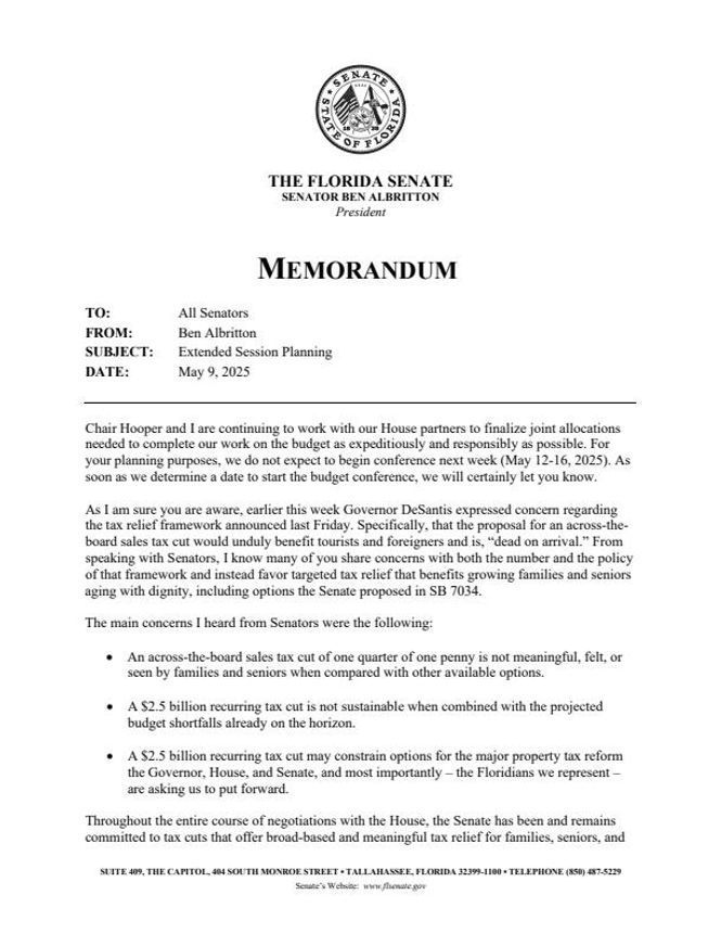 Today, the House and Senate announced that budget conferences will not begin next week and that the Legislative Session will be extended to June 30, 2025. Governor DeSantis’s comments earlier this week threating to veto the House’s proposed broad-based sales tax rate reduction have derailed the negotiations.